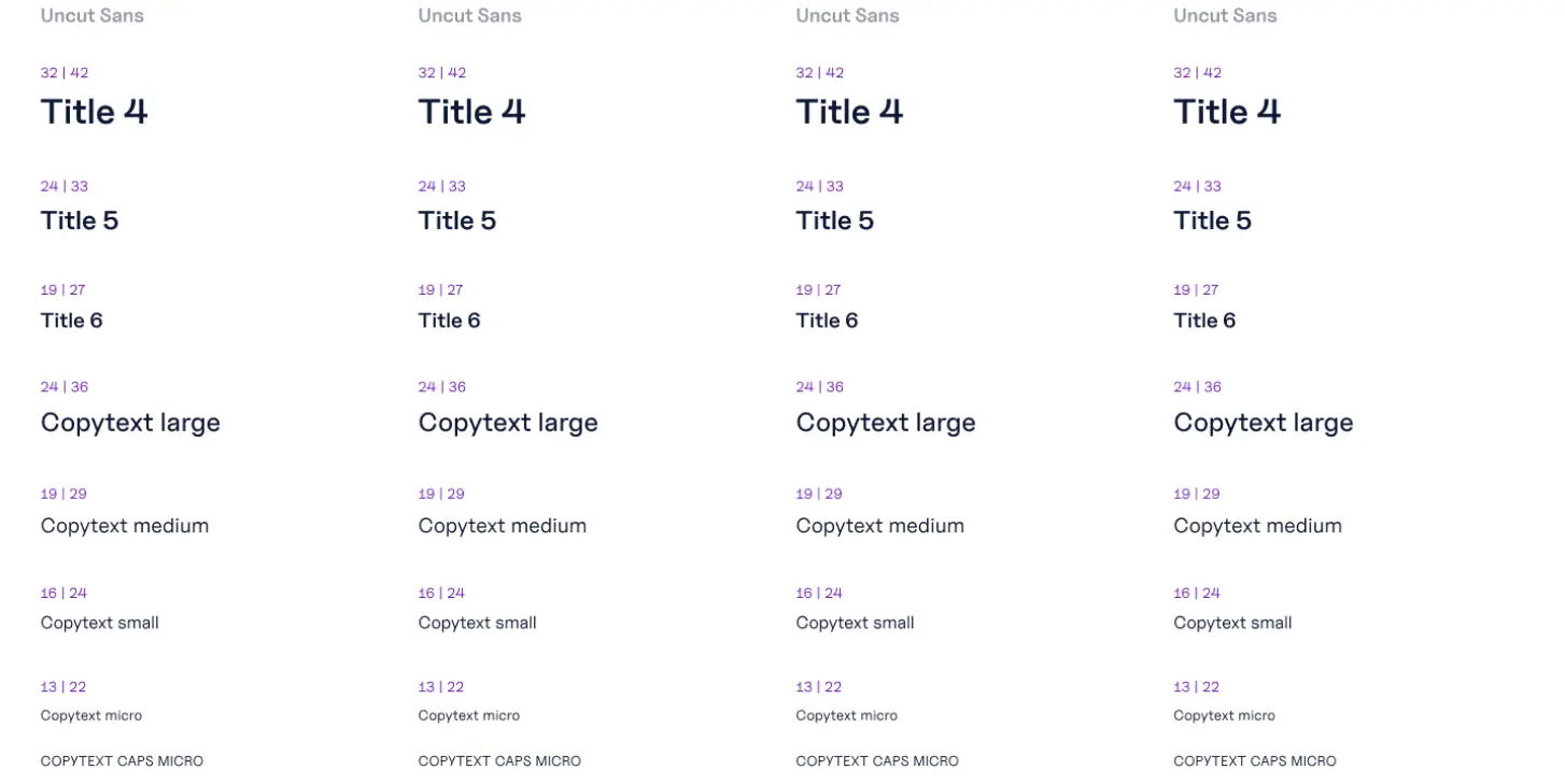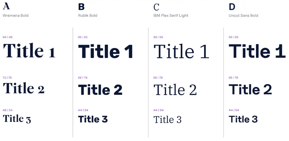 Benutzer des Webbaukastens können eines von vier Typografieschemen wählen. Das gewählt Typografieschema überträgt sich dann automatisch auf alle verfügbaren Komponenten und Textstyles. Eine Durchmischung der Schriften ist nicht möglich, d.h., alle Headlines haben als Schriftart entweder Wremena, Rubik Bold, IBM Plex Serif Light oder Uncut Sans Bold.